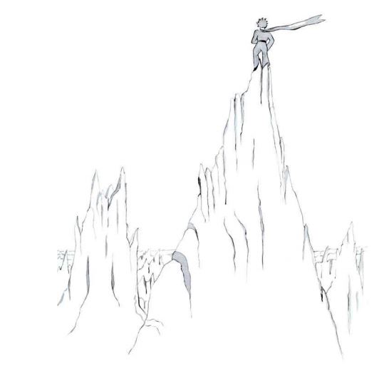 Litli prinsinn klifraði upp á hátt fjall. 🔊 Einu fjöllin sem hann hafði kynnast voru eldfjöllin þrjú sem náðu honum í hné. 🔊 Og hann notaði kulnaða fjallið sem gullstól. 🔊 "Af svona háu fjalli, sagði hann við sjálfan sig, mun ég sjá í einu allan hnöttinn og alla mennina …" En hann sá ekkert nema oddhvassa fjallstinda. 🔊