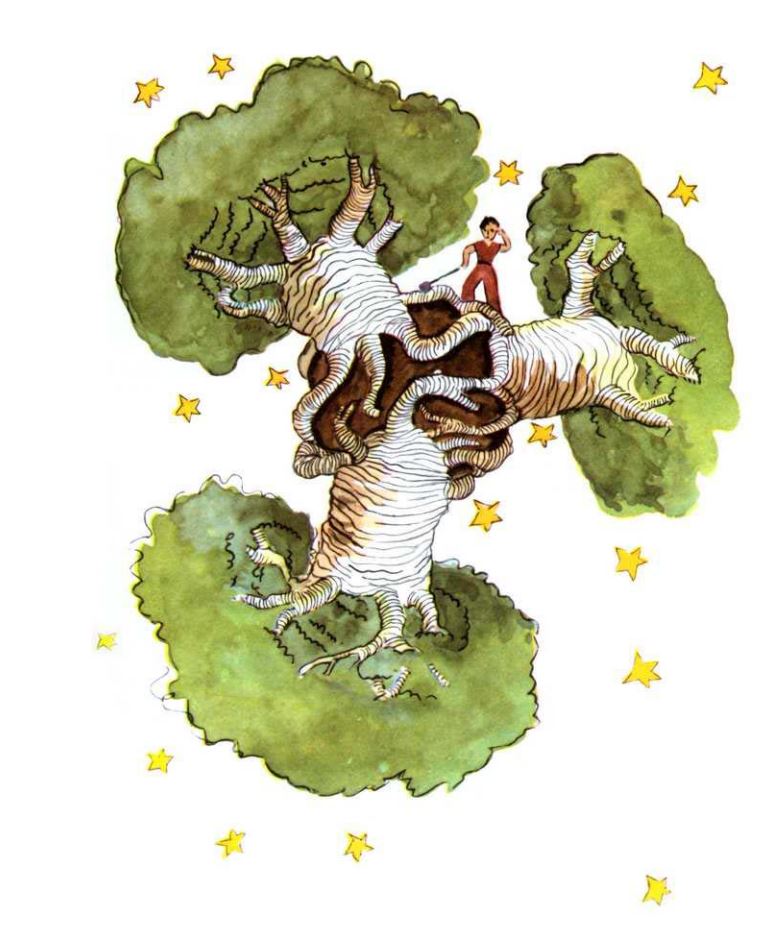 Ég benti litla prinsinum á að baóbabb-trén væru ekki runnar heldur tré á stærð við kirkjur og jafnvel þótt hann tæki með sér heila fílahjörð myndi sú hjörð ekki vinna á einu baóbabb-tré. 🔊